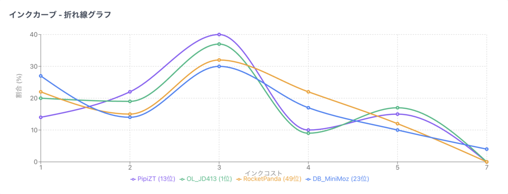 4コスト帯の比率にはデッキごとの差があり、戦略の違いがインクカーブにも表れています。