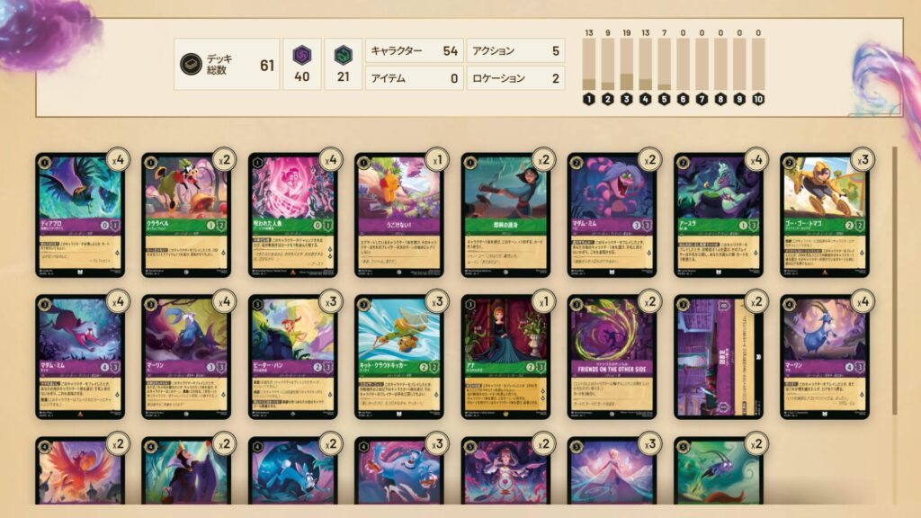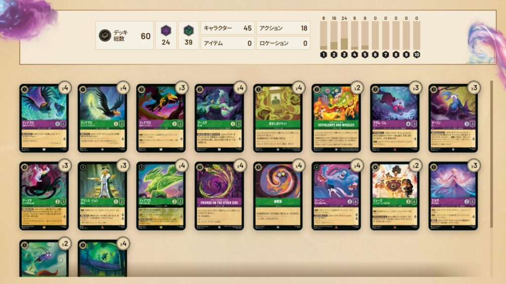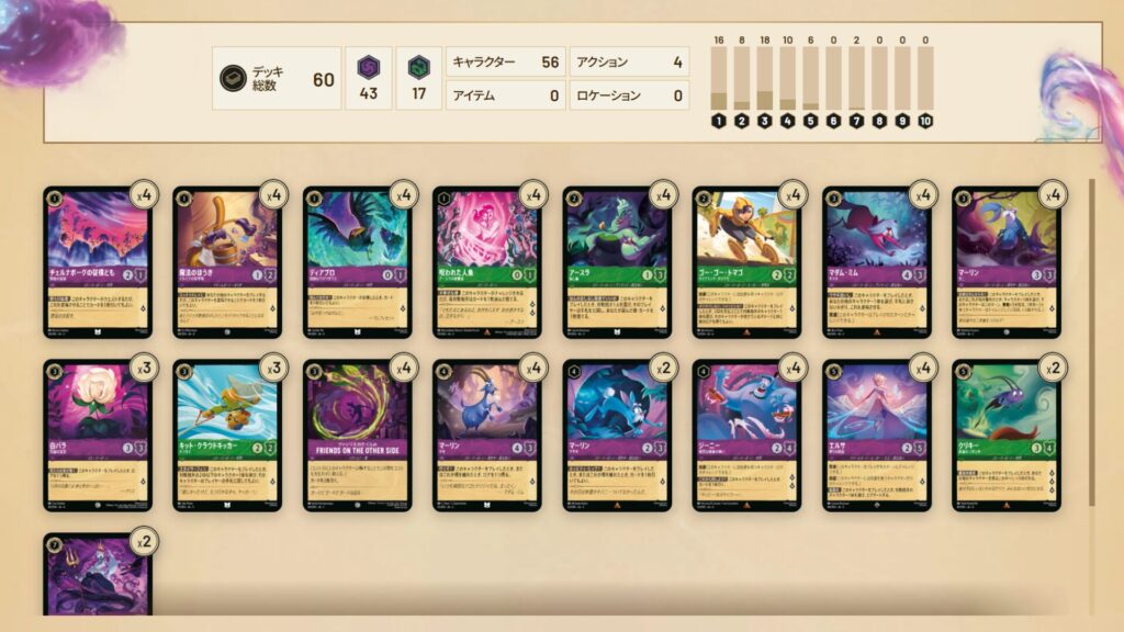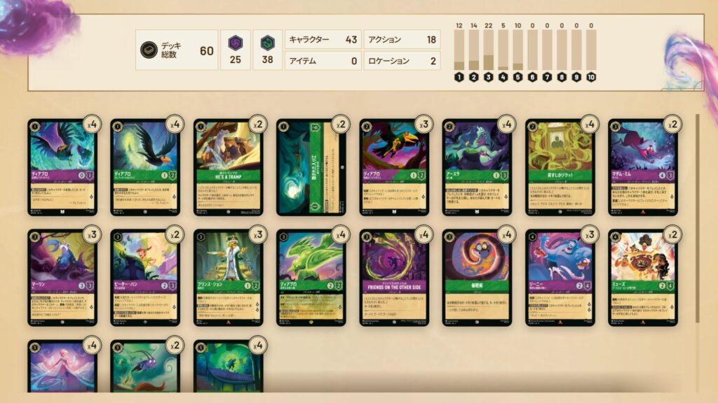 2025年UK Games Expo大会で結果を残したアメジスト/エメラルドデッキは、共通カードによる安定した土台と、3コスト帯を中心としたインクカーブを強みとしています。
