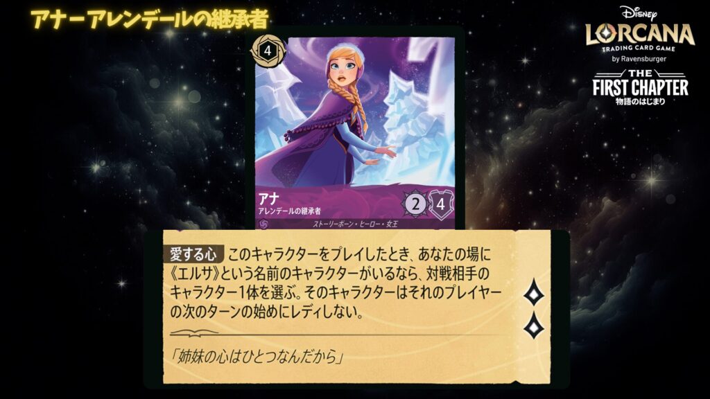 このデッキ最大の特徴は、アナとエルサが並ぶことで効果を発揮する点です。