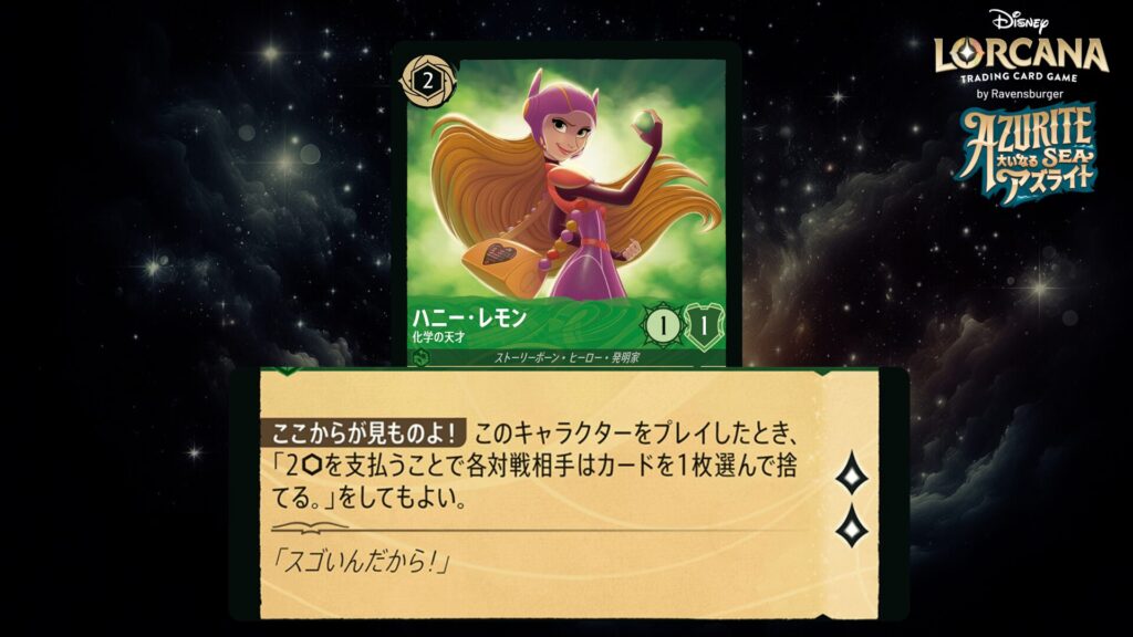 このキャラクターをプレイしたとき、「2インクを支払うことで各対戦相手はカードを1枚選んで捨てる。」をしてもよい。