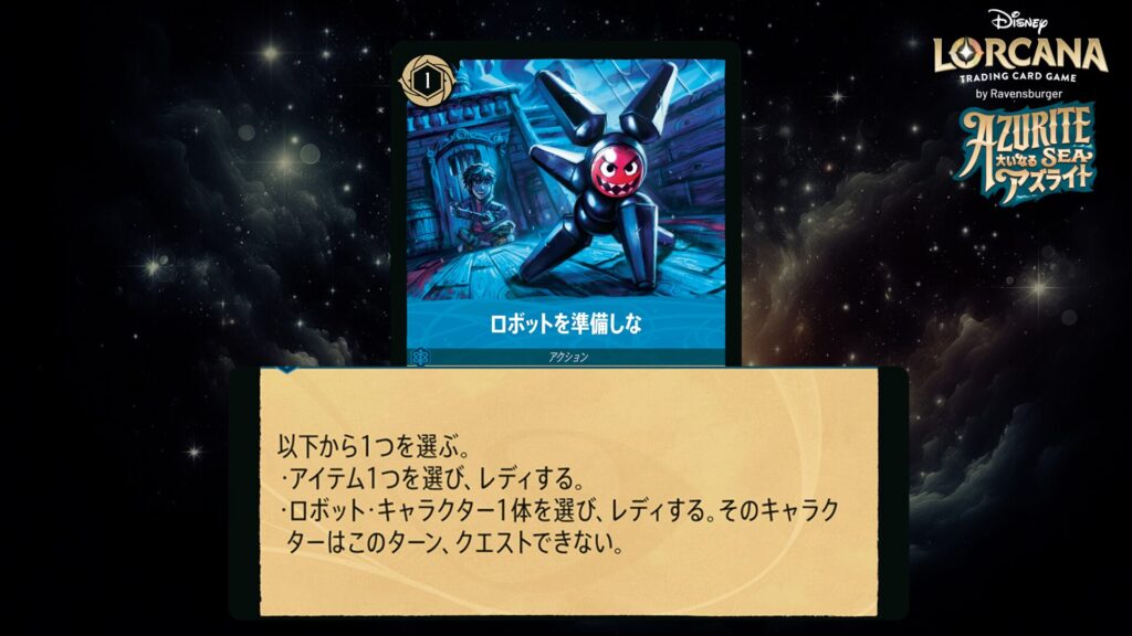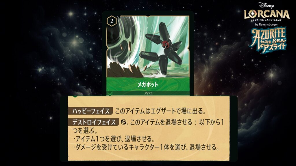 エグザート,2インク : あなたのデッキからアイテム・カード1枚かロボット・キャラクター・カード1枚を探してプレイヤー全員に公開する。デッキをシャッフルしてそのカードを一番上に置く。