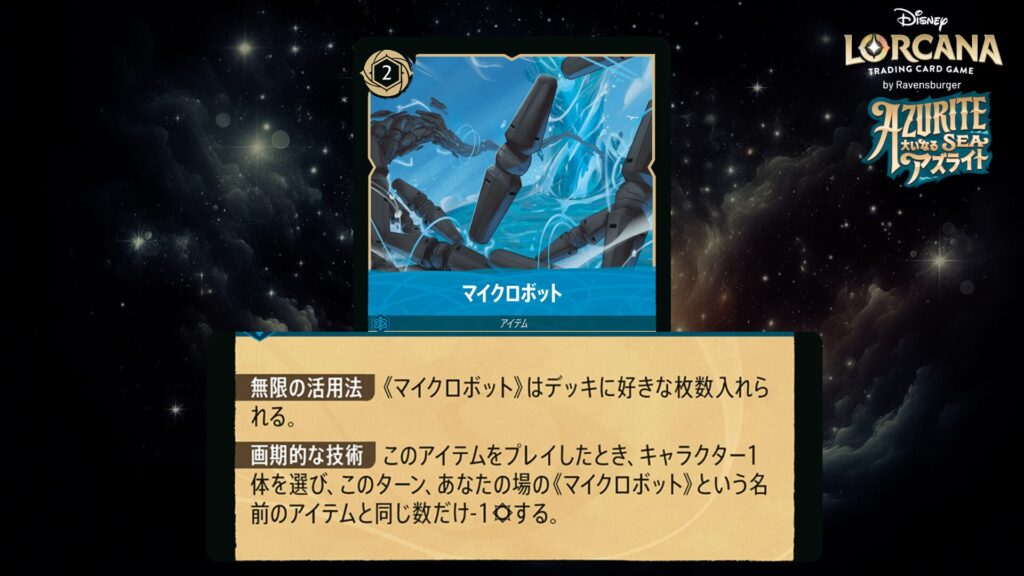 このアイテムをプレイしたとき、キャラクター1体を選び、このターン、あなたの場の《マイクロボット》という名前のアイテムと同じ数だけ攻撃力-1する。