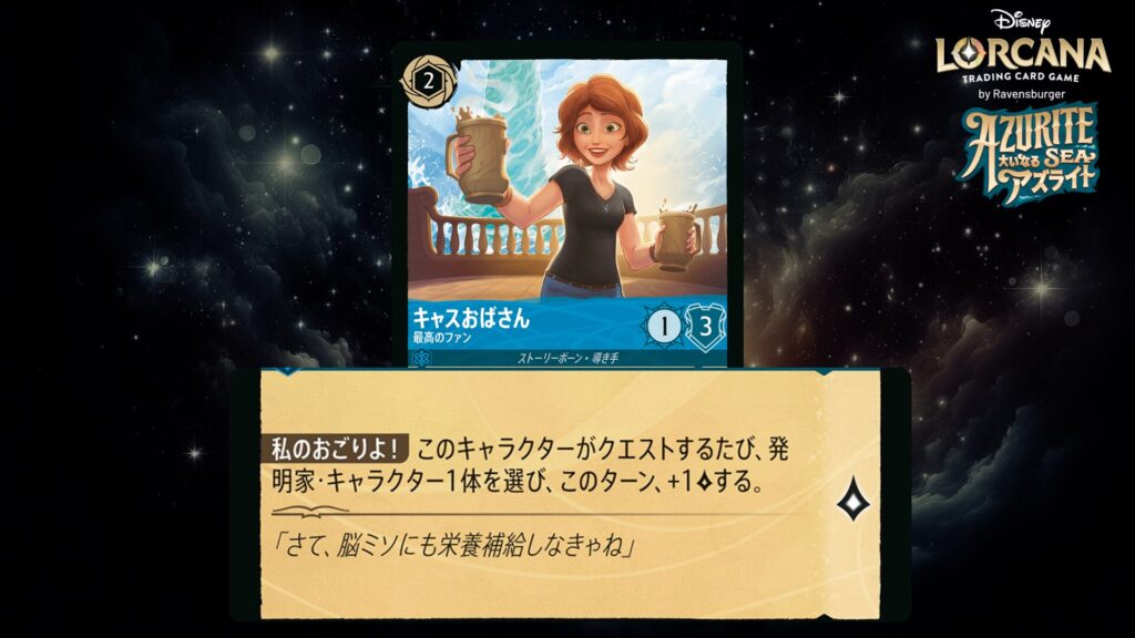 🎯 <支援>(このキャラクターがクエストするたび、他のキャラクター1体を選び、このターン、このキャラクターの攻撃力をそれの攻撃力に加えてもよい。)