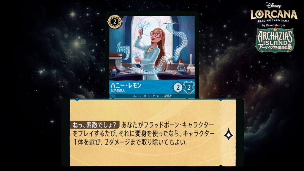 このキャラクターをプレイしたとき、2インクを支払うことで対戦相手のキャラクター1体を選び、そのキャラクターが受けているダメージと同じ数のロアを得てもよい。