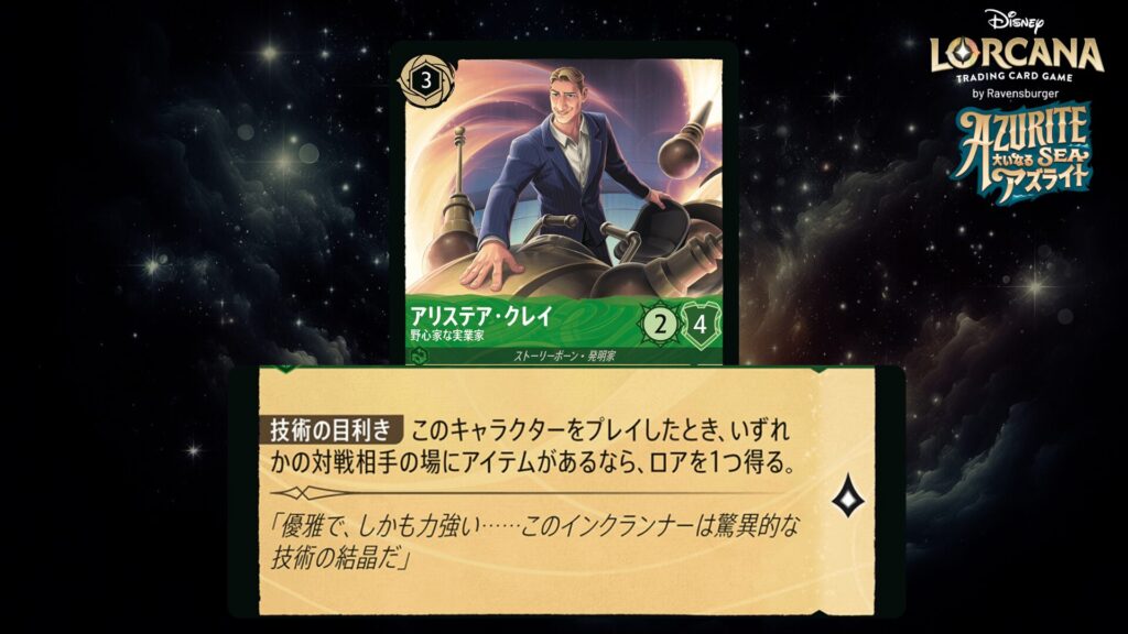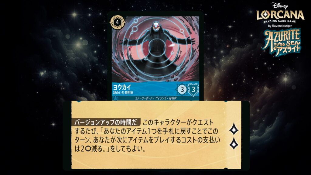 このキャラクターがクエストするたび、「あなたのアイテム1つを手札に戻すことでこのターン、あなたが次にアイテムをプレイするコストの支払いは2インク減る。」をしてもよい。