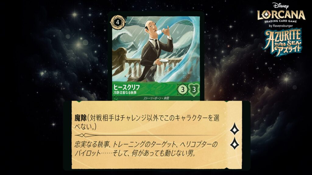 下にカードがあるあなたのフラッドボーン・キャラクターは<回避>と<魔除>を得る。(回避を持つキャラクターには回避を持つキャラクターだけがチャレンジできる。対戦相手はチャレンジ以外で魔除を持つあなたのキャラクターを選べない。)