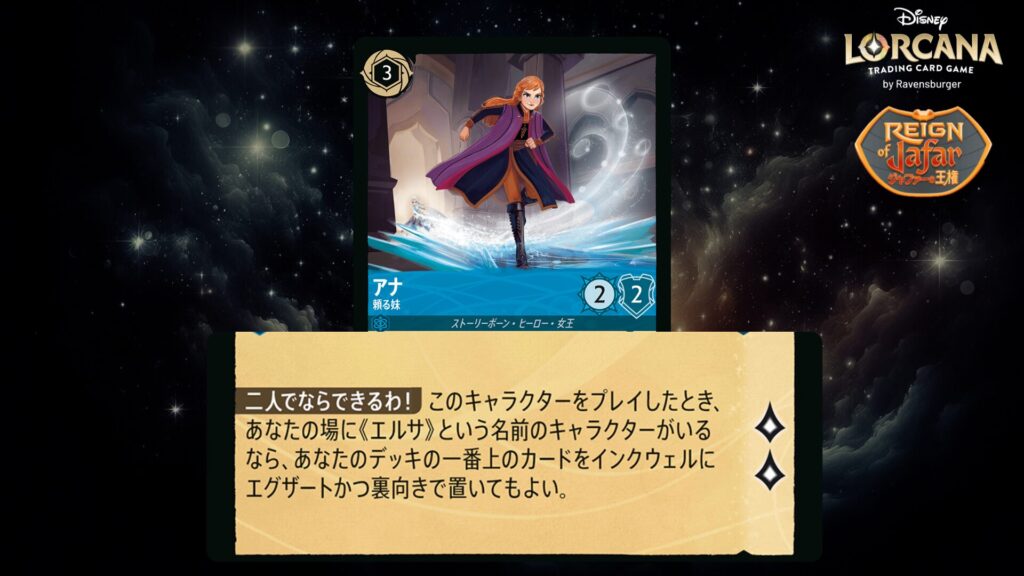 このキャラクターをプレイしたとき、あなたの場に《エルサ》という名前のキャラクターがいるなら、あなたのデッキの一番上のカードをインクウェルにエグザートかつ裏向きで置いてもよい。