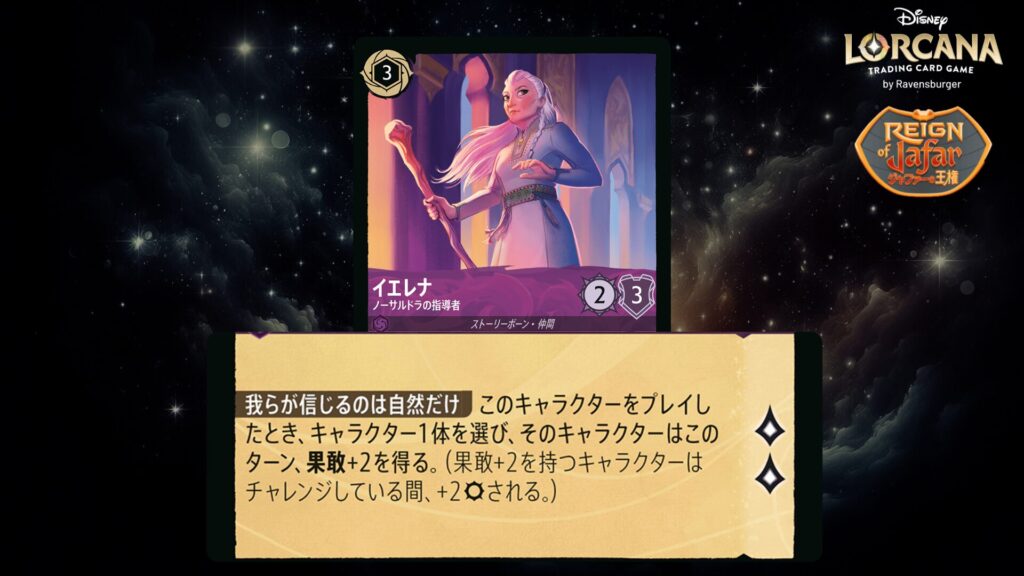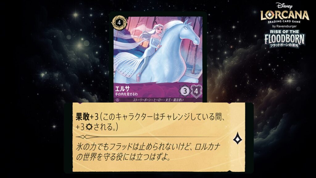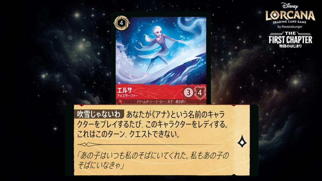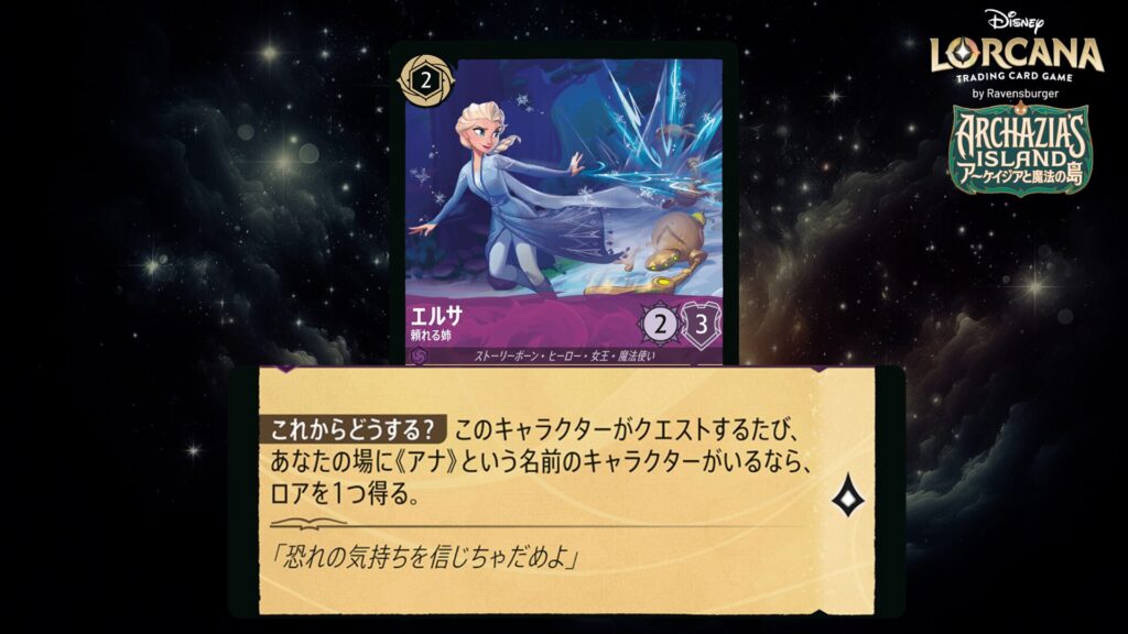このキャラクターがクエストするたび、あなたの場に《エルサ》という名前のキャラクターがいるなら、カードを1枚引いてもよい。