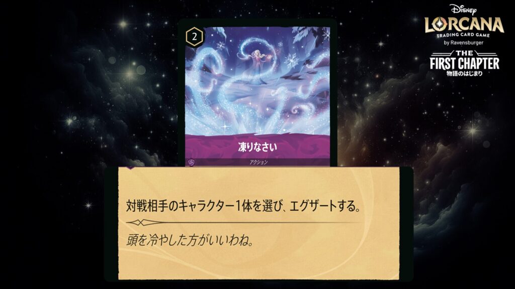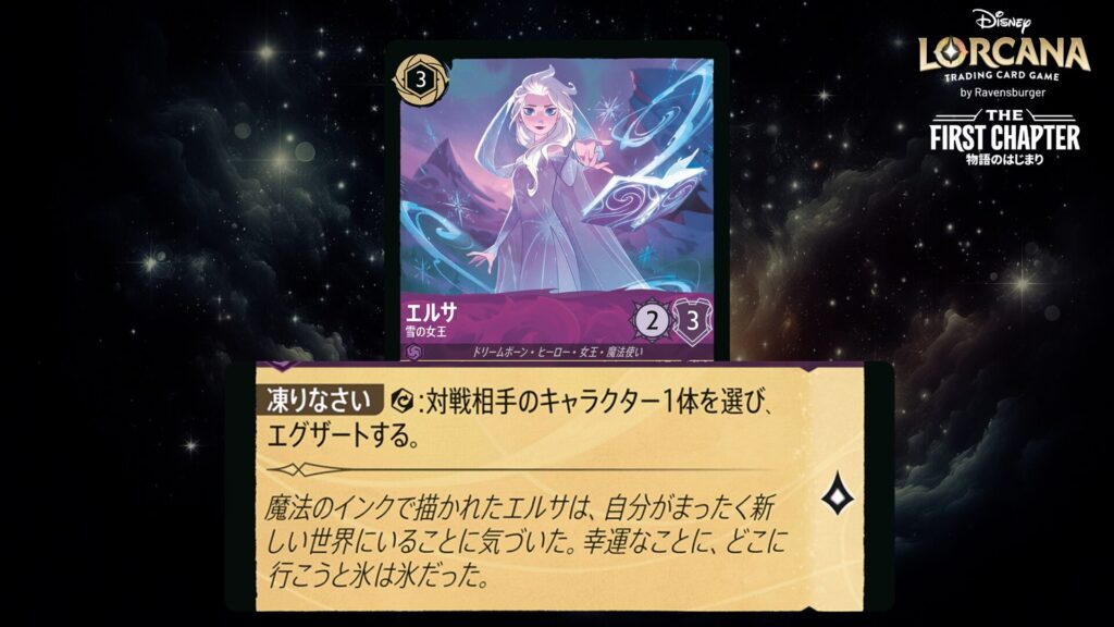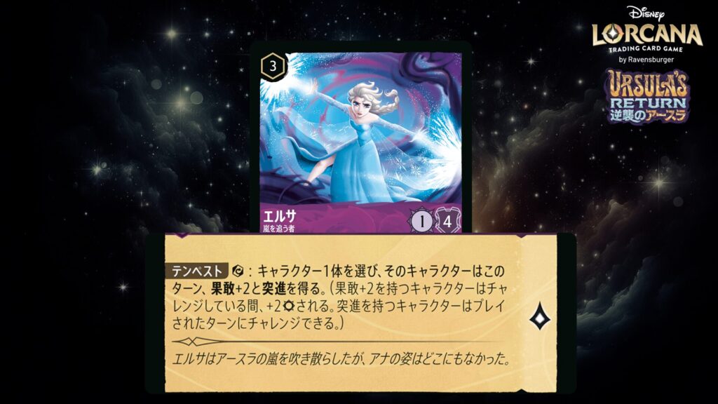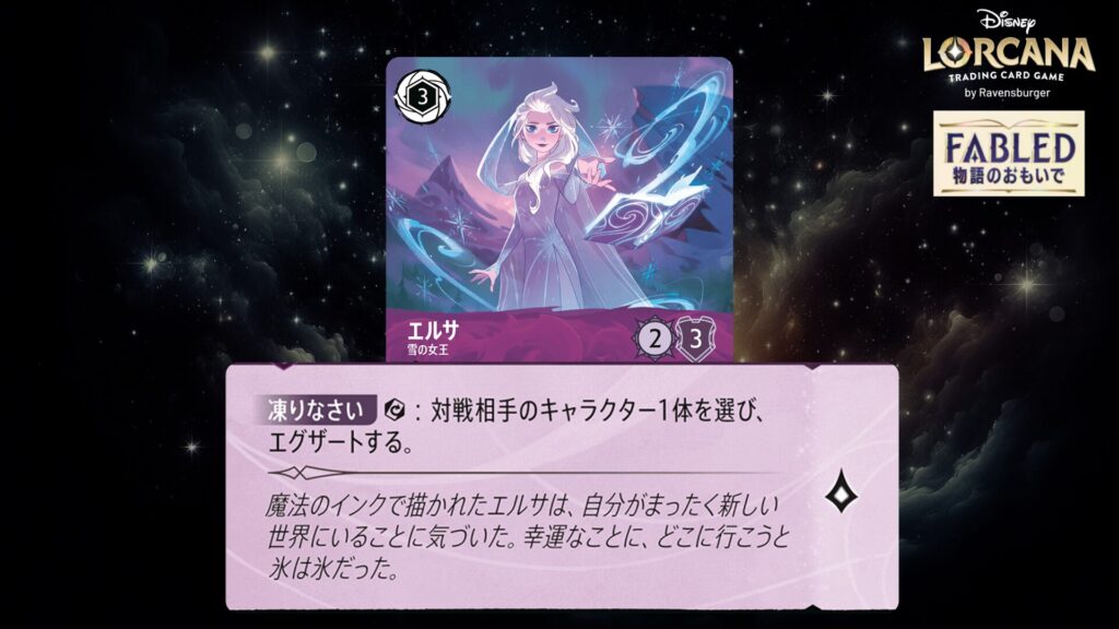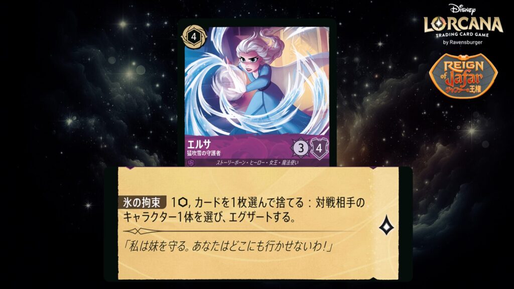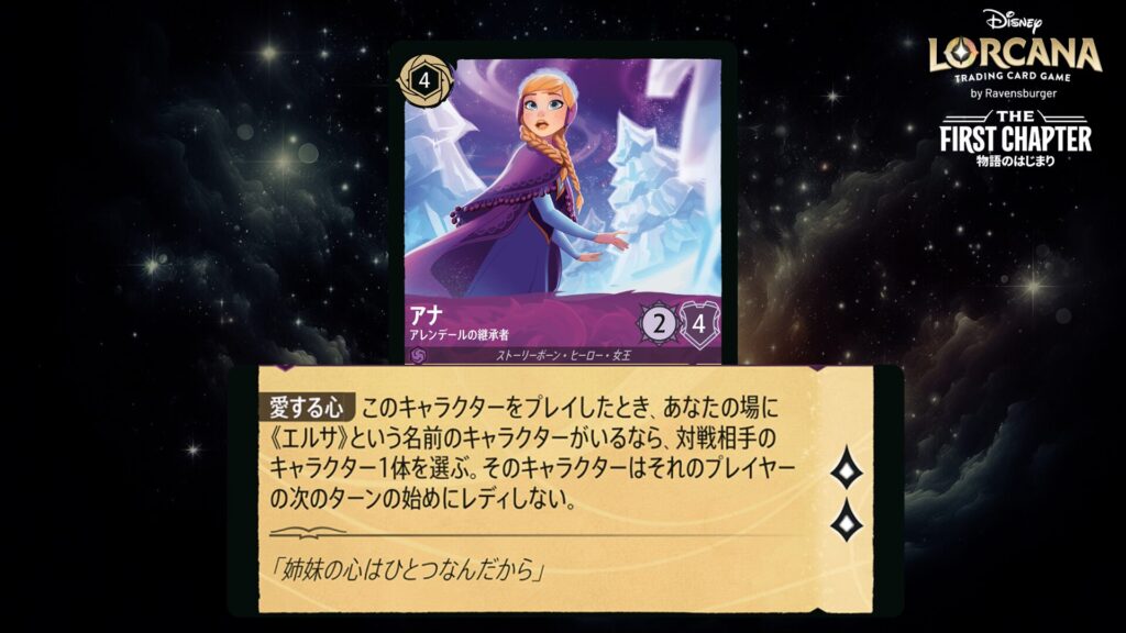 このキャラクターをプレイしたとき、あなたの場に《エルサ》という名前のキャラクターがいるなら、対戦相手のキャラクター1体を選ぶ。そのキャラクターはそれのプレイヤーの次のターンの始めにレディしない。