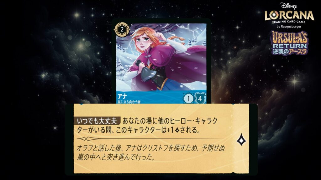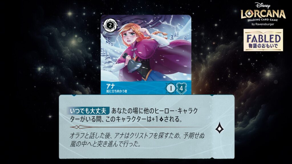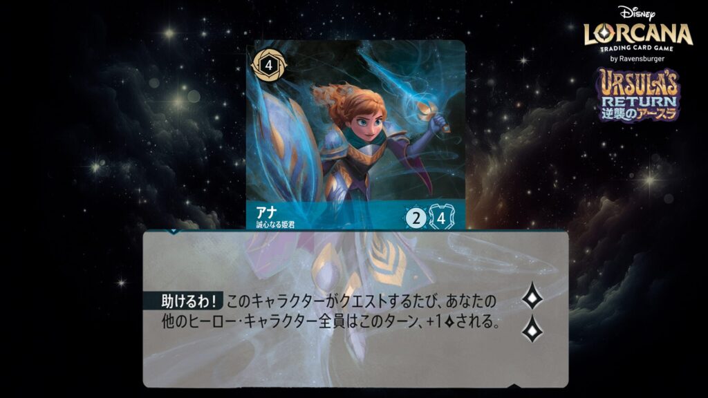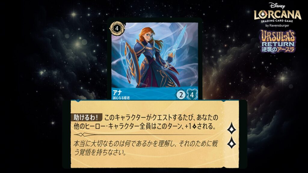 このキャラクターがクエストするたび、あなたの場に《アナ》という名前のキャラクターがいるなら、ロアを1つ得る。