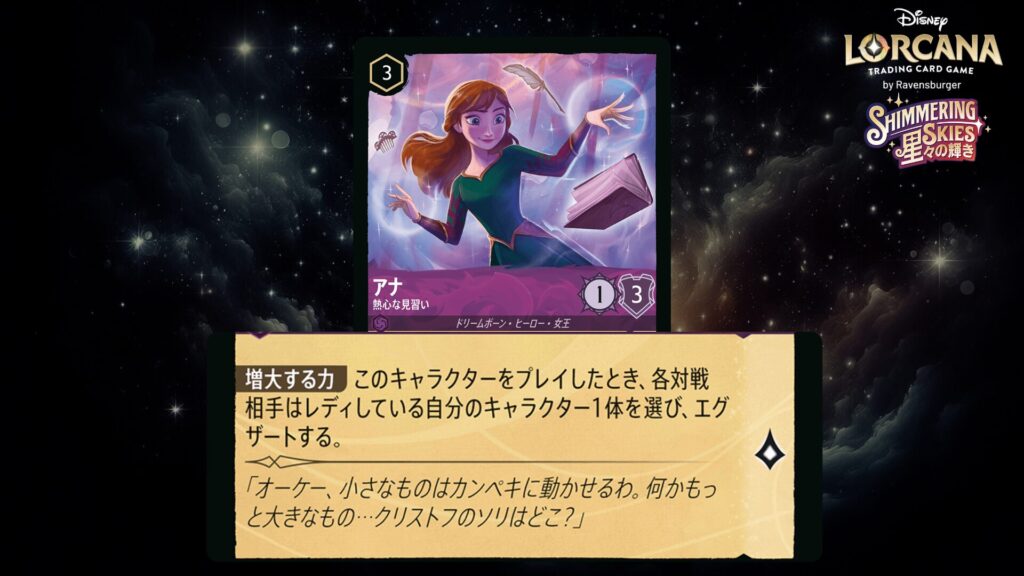 このキャラクターがクエストするたび、キャラクター1体を選び、エグザートしてもよい。あなたの場に《アナ》という名前のキャラクターがいて、そうしたなら、そのキャラクターはそれのプレイヤーの次のターンの始めにレディしない。