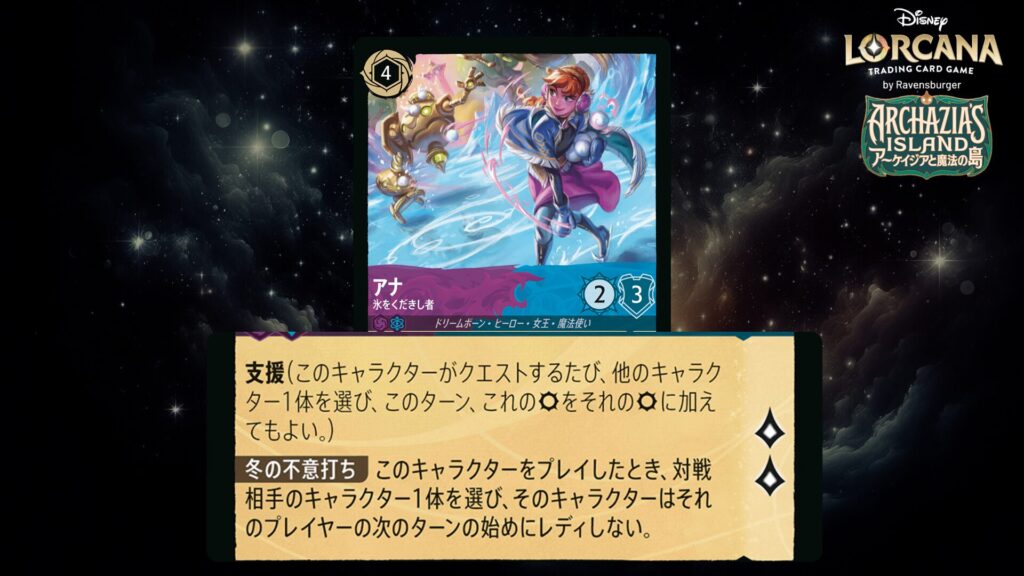 ディズニー・ロルカナに登場する「アナと雪の女王」のカードを全セット分、1枚ずつ詳しくご紹介します。