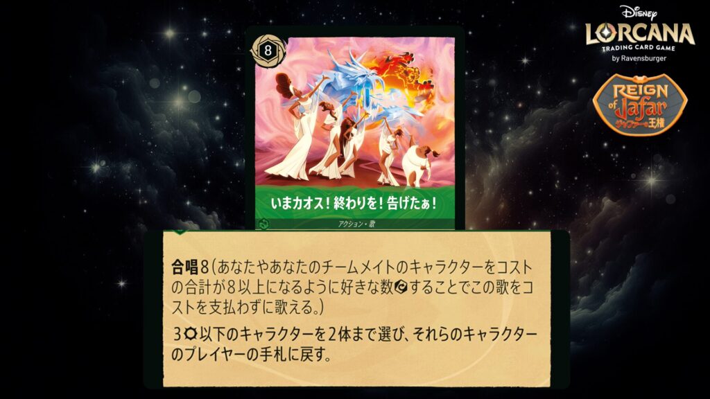 🎯 《合唱》8(あなたやあなたのチームメイトのキャラクターをコストの合計が8以上になるように好きな数エグザートすることでこの歌をコストを支払わずに歌える。)
