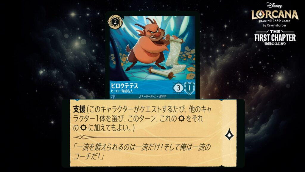 🎯 《支援》(このキャラクターがクエストするたび、他のキャラクター1体を選び、このターン、これの攻撃力をそれの攻撃力に加えてもよい。)