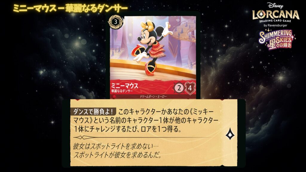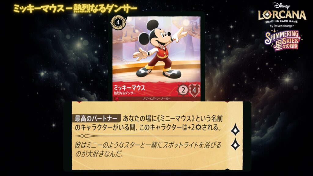 特にミッキーとミニーの相性がよく、並んだときに真価を発揮するカードが多いのが特徴です。
