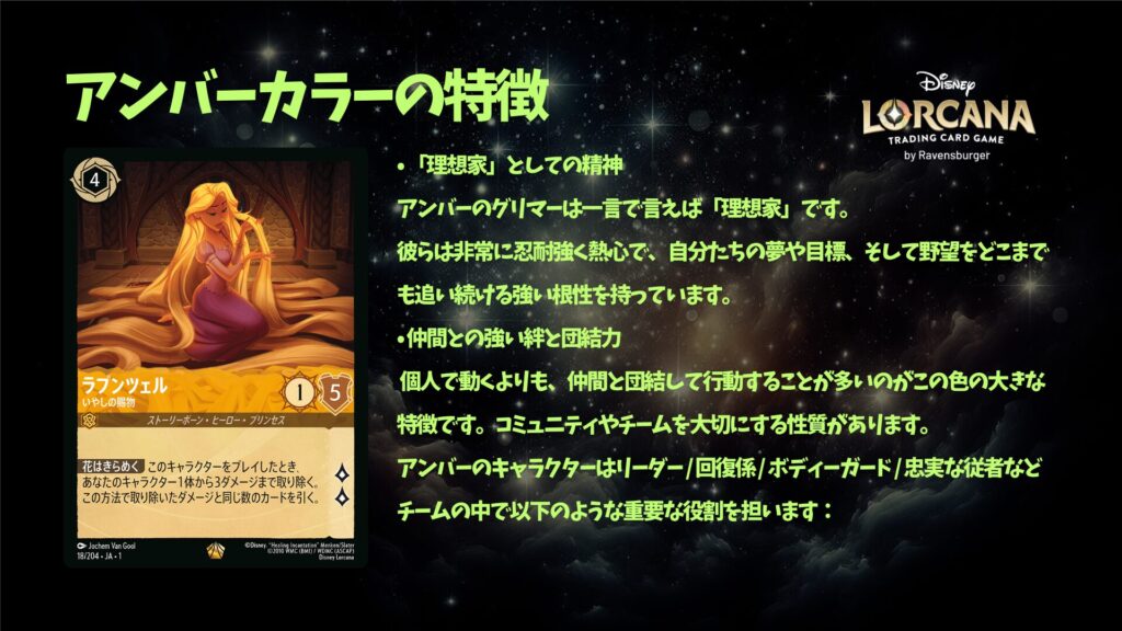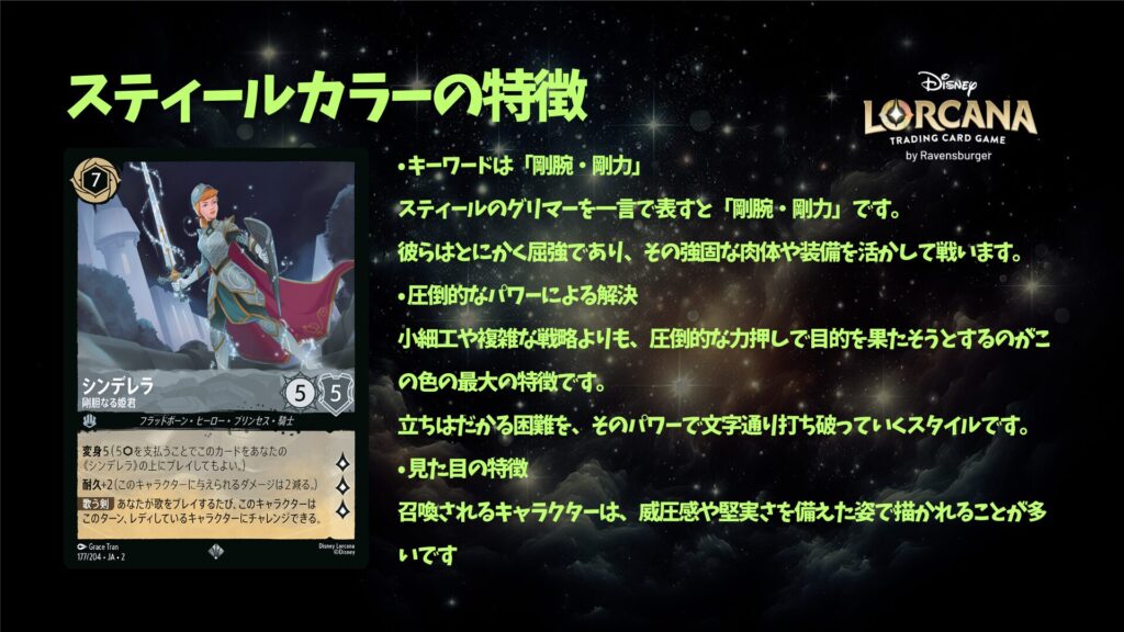 ディズニー・ロルカナにはさまざまなデッキがありますが、その中でも物語性と分かりやすさを両立しているのが「アンバー・スティール」のプリンセス・ソングデッキです。