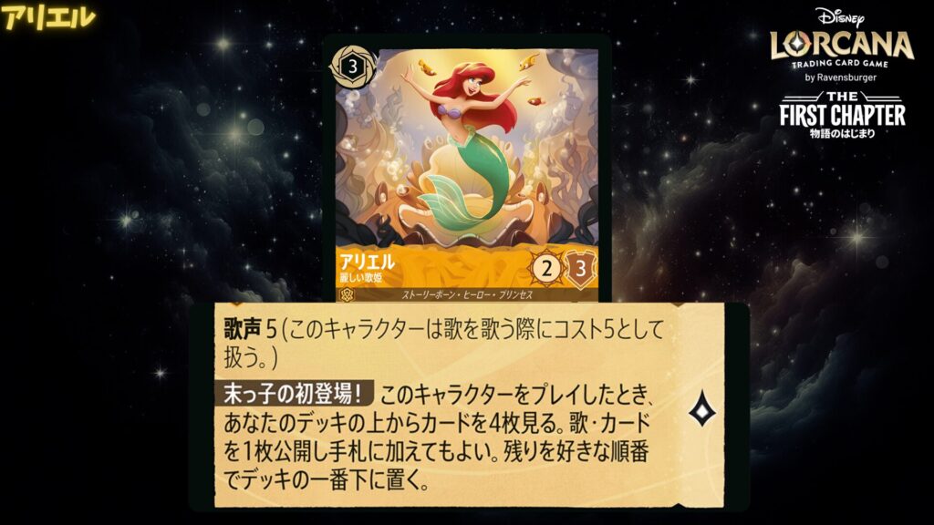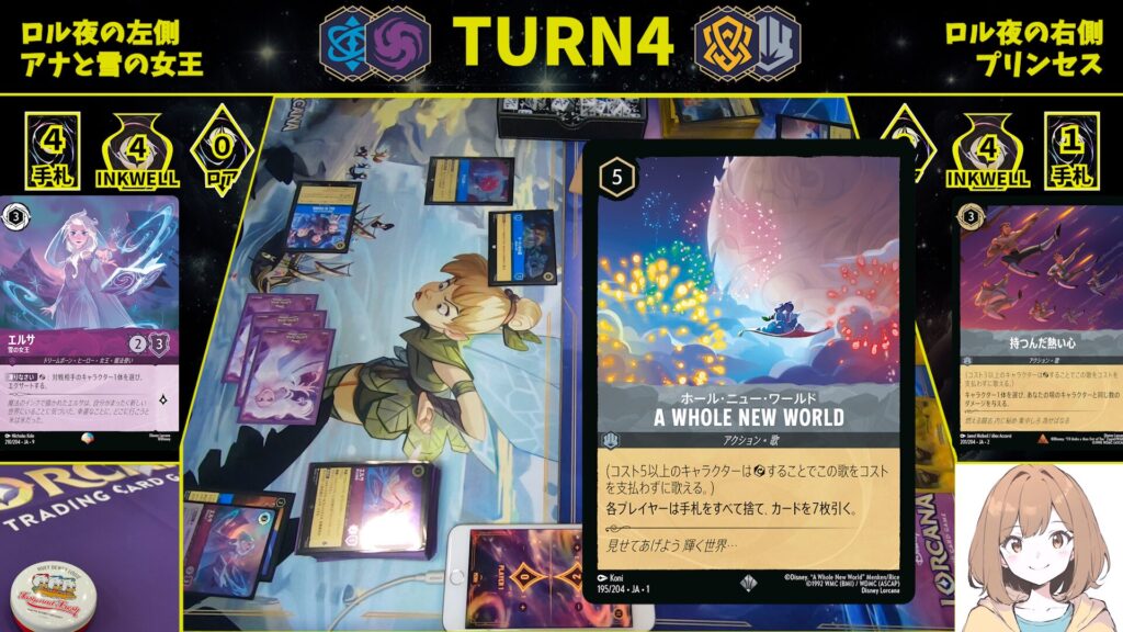アリエルの能力から「ホール・ニュー・ワールド」を引けると、お互いの手札を入れ替え、流れを一気に変えられます。
