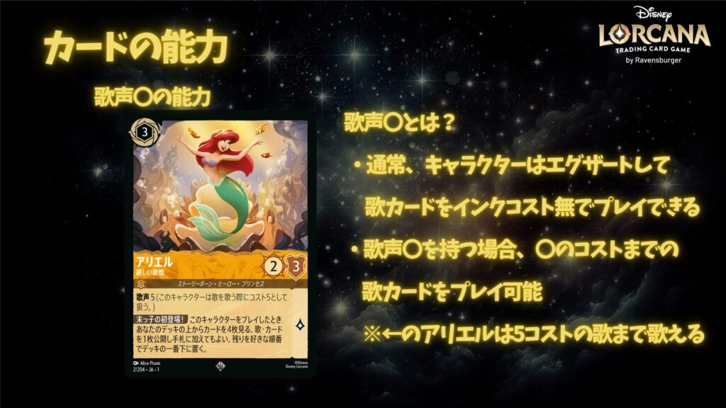 ロルカナでは、一部のキャラクターはインクを支払わずに歌カードを使えます。これが「歌声」という能力です。