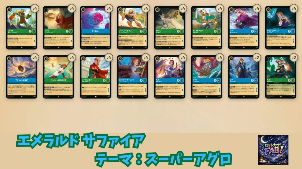 ディズニー・ロルカナでスピード重視のデッキを使いたい方に向けて、エメラルド/サファイアの「スーパーアグロ」デッキをわかりやすく解説します。