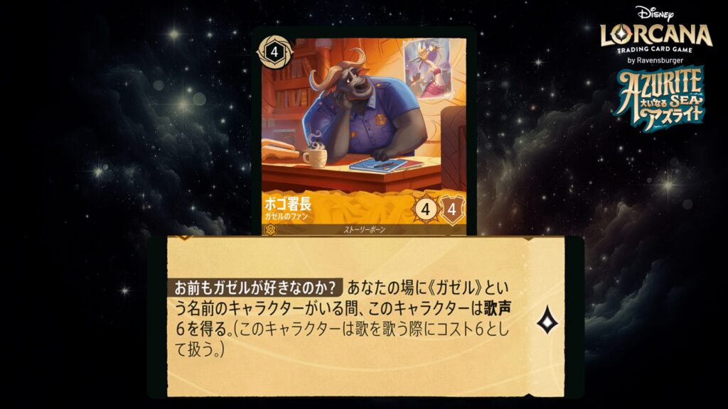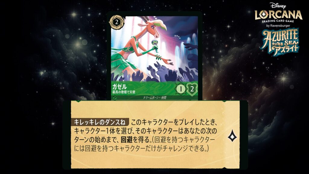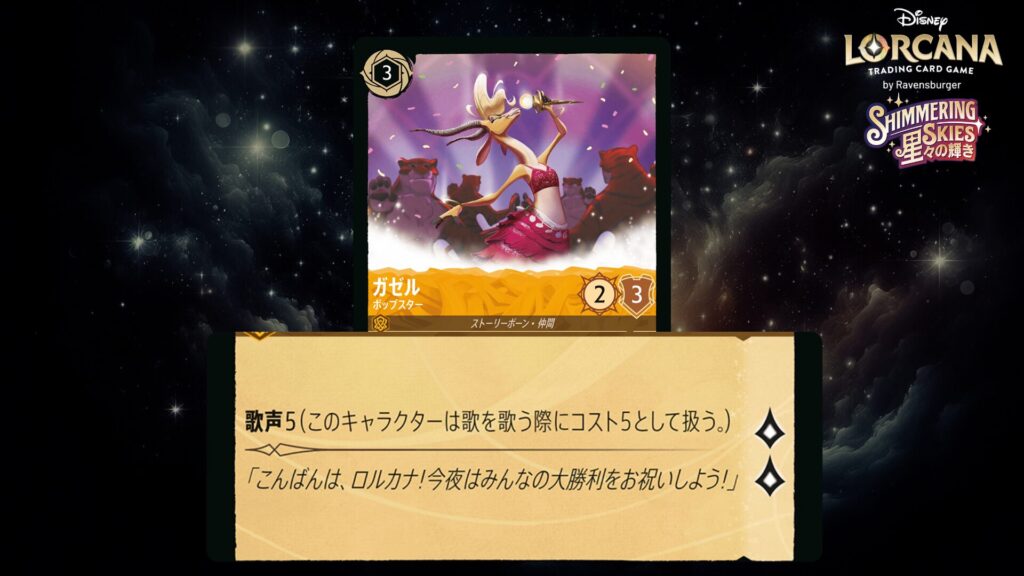 あなたの場に《ガゼル》という名前のキャラクターがいる間、このキャラクターは<歌声>6を得る。(このキャラクターは歌を歌う際にコスト6として扱う。)