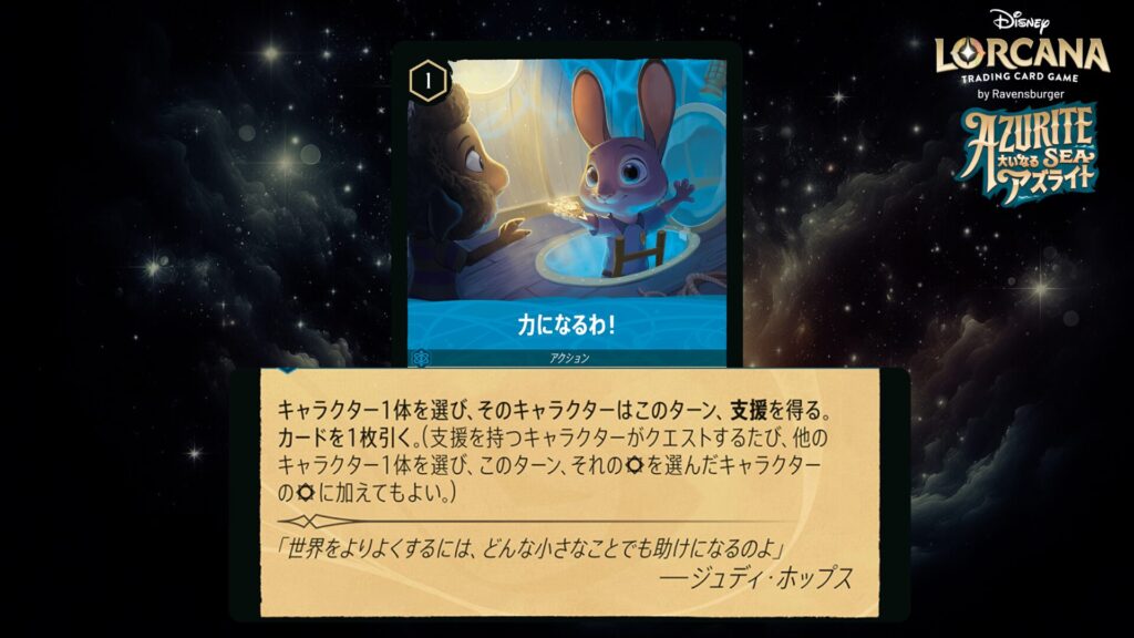 🎯 キャラクター1体を選び、そのキャラクターはこのターン、<支援>を得る。カードを1枚引く。(支援を持つキャラクターがクエストするたび、他のキャラクター1体を選び、このターン、それの攻撃力を選んだキャラクターの攻撃力に加えてもよい。)